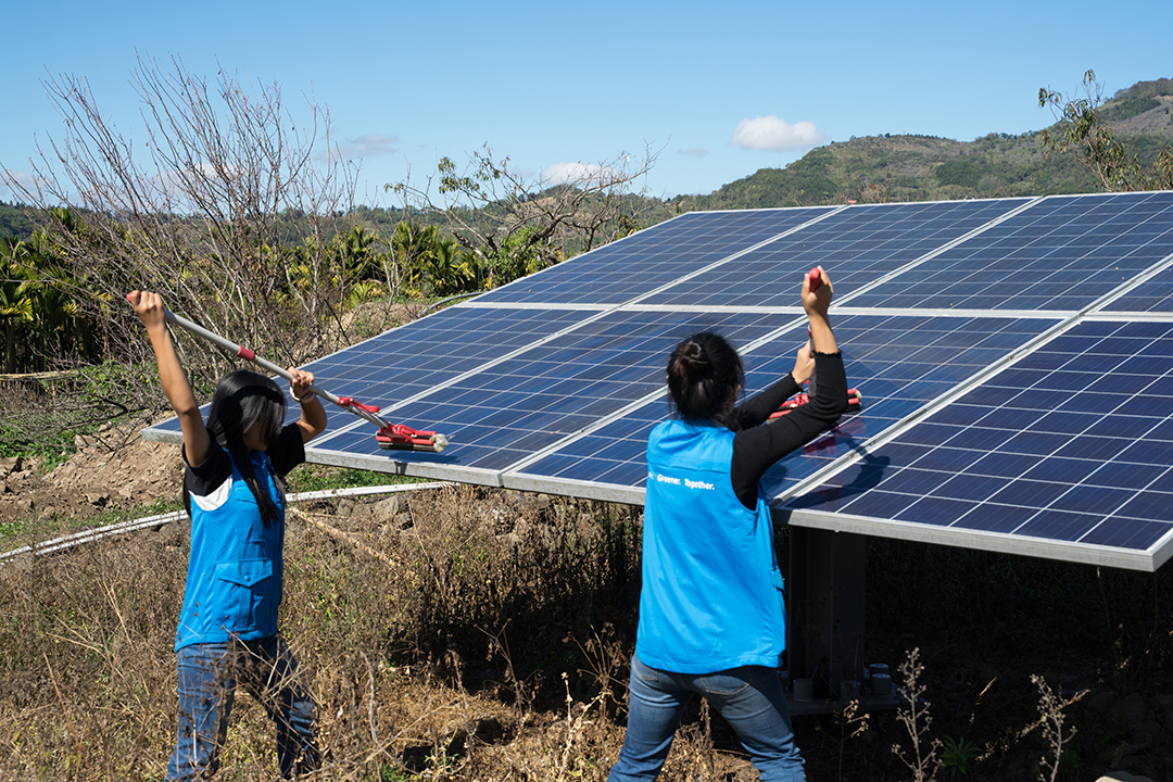 在台達志工們的帶領下,捲起袖子打掃太陽能板是我們親身落實的第一步,因為太陽能板越乾淨,發電效率越高,在大太陽下我們提著幾桶裝滿水的水桶和幾支拖把,為平常提供電力給那瑪夏民權國小的太陽能板做清潔,偶爾還要爬上梯子才能把整片太陽能板擦乾淨,雖然會因為太陽太大而想放棄,但能藉著個機會跟曾經一起讀這所國小的同學們一起同心完成這份工作真的很好玩,這也算回饋母校吧!因為不希望農藥殺害校園的昆蟲們,志工們穿著青蛙裝,下去生態池整理池子,伸手撈起幾些根已離土的蓮花,為這座生態池換上乾淨的裙襬,好讓魚和蝌蚪能在裡面開心玩耍,也減少蚊子出現。