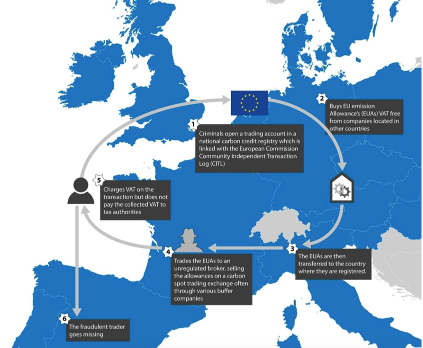 在2009年,歐盟開始注意到碳市場不尋常的交易量,一度緊急停止交易。歐盟刑警組織(Europol)估計那段期間,部分會員國的交易幾乎九成都是詐欺,最後讓整個歐盟產生超過60億歐元的稅收損失,由於其中16億歐元集中在法國,承擔高額損失的該國交易所BleuNext,最後更因此關門大吉。