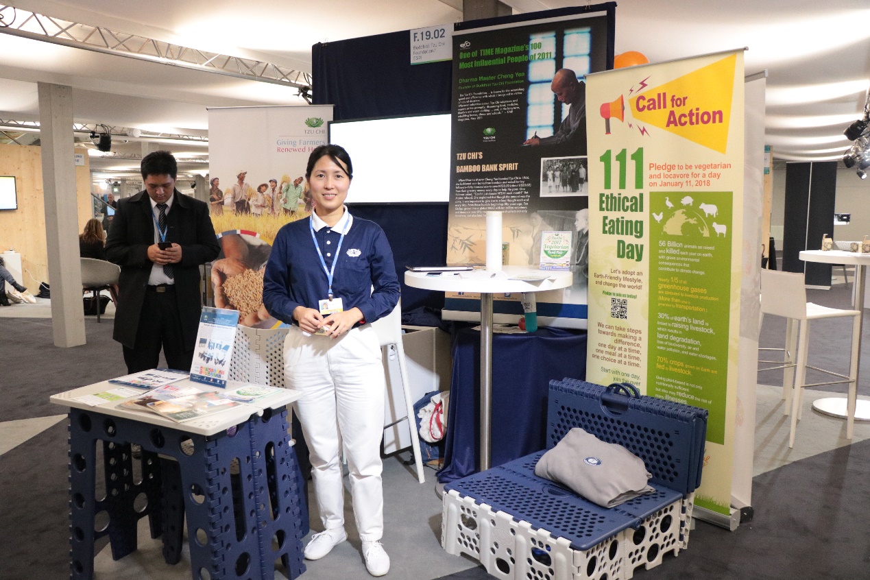 再來是大家都很熟悉的「慈濟」,除了人道救援,慈濟在氣候議題扮演的角色可說是與大家息息相關,例如垃圾分類、資源回收、將回收寶特瓶抽絲做成毛毯等,今年他們在波昂還推廣「世界素食日」(每年1月11日),呼籲大家從一年一天、一個月一天、到一周一天,逐步降低飲食方面的碳足跡,筆者參訪時還收到師姐送的素食軟糖,口味蠻特別的。