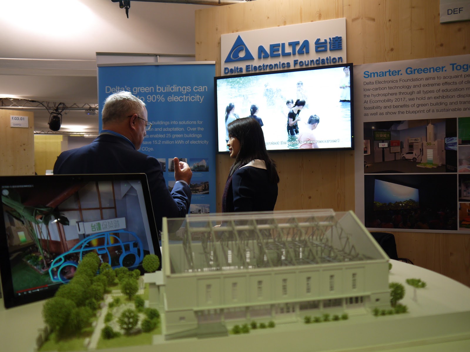 台達延續剛在高雄駁二藝術特殊結束的「綠築跡 台達綠建築展」精神,今年在COP23申請到第二週的展示攤位,向國際友人分享十餘年來累積捐建的25棟節能綠建築,並結合企業研發的低碳交通解決方案,再加上多年策展的環境教育宣導成果。此外,基金會執行長郭珊珊也受到ICLEI的邀請,到周邊會議上發表演說。