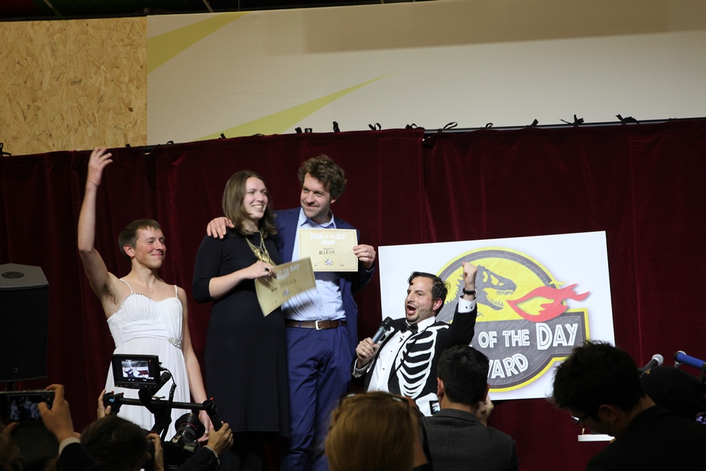 | 談判期間氣候行動網 Climate Action Network 每日會以嘲諷的方式,頒發化石獎給當日談判立場或發言最糟糕的國家,以敦促各國採取更積極的態度來談判。圖為第一天的頒獎典禮,每日化石獎頒獎給比利時與紐西蘭。(謝雯凱攝) |