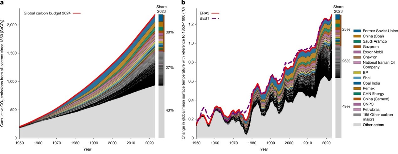 研究指出,碳排大戶製造的排放增加了氣候變遷與熱浪的風險。圖a為碳排大戶自1850年來累積的二氧化碳排放量;圖b則模擬了碳排大戶對全球平均氣溫上升的影響。照片來源:Quilcaille et al., Nature (2025)(本圖經裁切,CC BY 4.0)