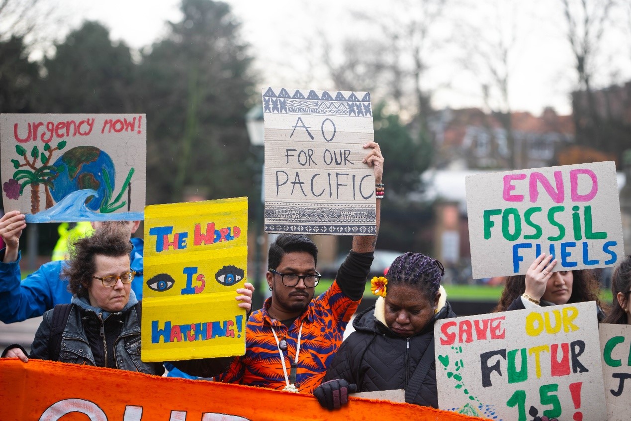 2024年底時,國際法院氣候變遷諮詢意見聽證會開始之際,民眾在法院外舉牌聲援太平洋島國。照片來源:PISFCC