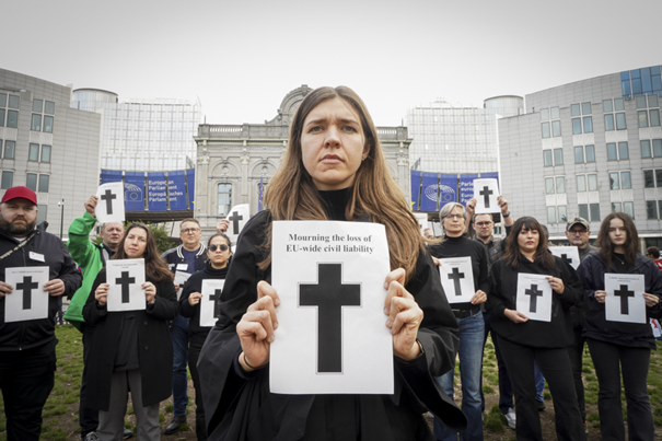 歐洲倡議組織The European Coalition for Corporate Justice在歐洲議會前手舉標語,哀悼被廢除的「歐洲民事責任制度」。照片來源: Clélie Chassignet /ECCJ新聞稿