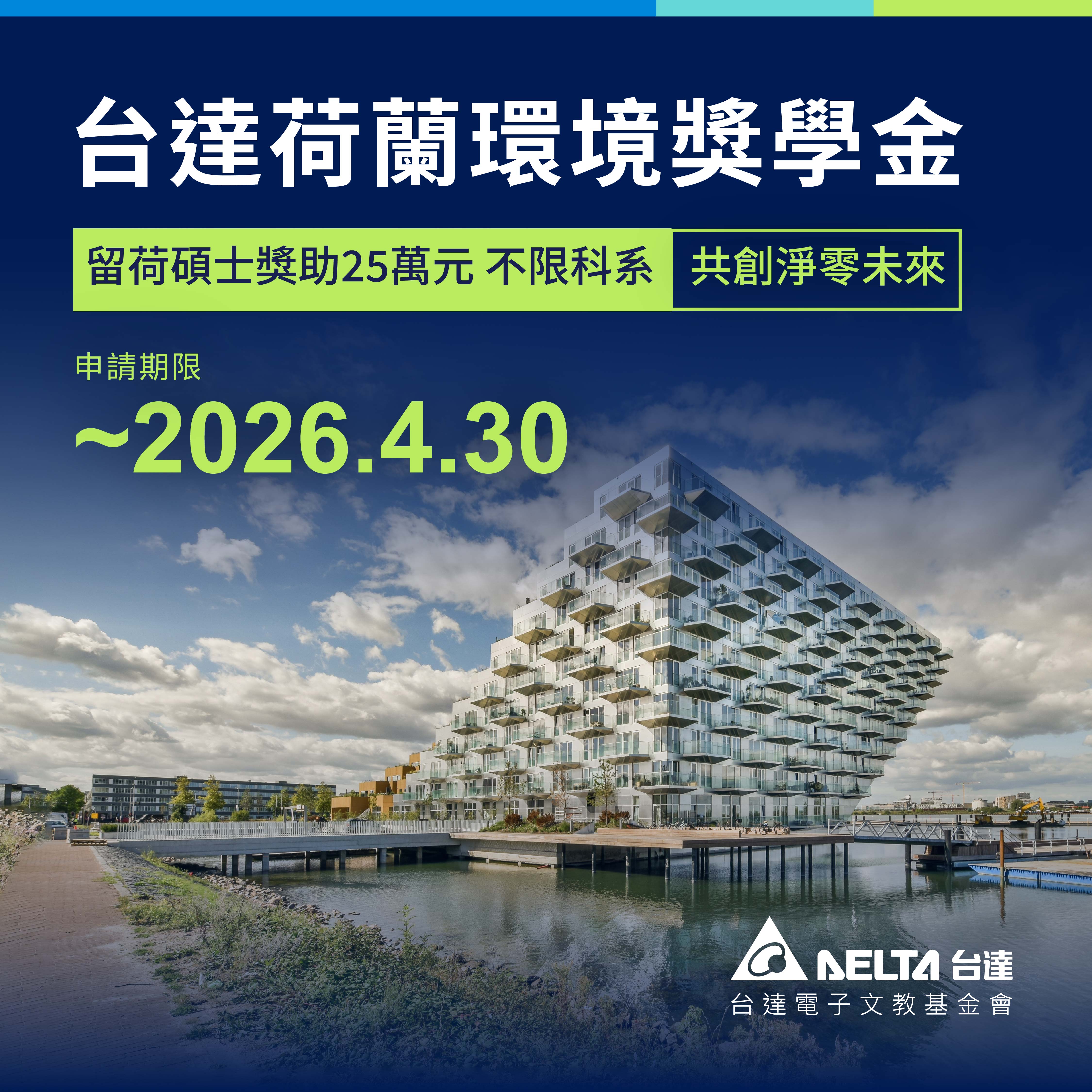 台達電子文教基金會2026年度「台達荷蘭環境獎學金」,自即日起開放申請。只要對赴荷蘭學習與環境及永續能源等相關領域,如:教育、工程、管理、設計、法經與政策等研究,具有經教育部認可的大學學歷,並對環境議題充滿熱忱者,均可申請。
